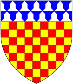 The arms of Raleigh are: Gules crusilly or, a bend vair, and are also shown as the second quartering of ten on an escutcheon on top of the monument. By marriage to the Raleigh heiress in the 14th century the Chichester family acquired the manor of Raleigh in the parish of Pilton, and many others. These arms are also those blazoned for "Henri de Ralle" on the following mediaeval rolls of arms: Dering Roll (185), St George's Roll (E406), Heralds' Roll (HE317), Charles' Roll (F207).[14][15]