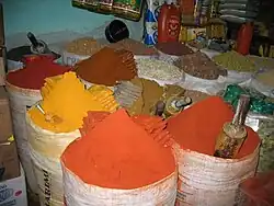 Chili powder (also spelled chile, chilli, or, alternatively, powdered chili) is the dried, pulverized fruit of one or more varieties of chili pepper, sometimes with the addition of other spices (in which case it is also sometimes known as chili powder blend or chili seasoning mix).[1] It is used as a spice (or spice blend) to add pungency (piquancy) and flavor to culinary dishes. In American English, the spelling is usually "chili"; in British English, "chilli" (with two "l"s) is used consistently.