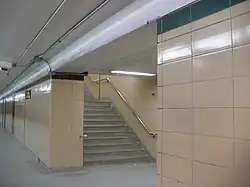 Different colour of trim tiles on either side of the exit stairway; new red-brown and the original green.