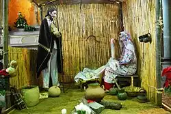 Traditional figures are made from ceramic or plaster. One of the more traditional areas that produce ceramic figures for nativity scenes is the Guadalajara area, especially the towns of Tonalá and Tlaquepaque.[1] From late November into December, the Tonalá market has dozens of stalls that sell nothing but supplies for nativity scenes.[4] In addition to the more usual figures, Mexican nativity scenes have a number of several unique ones. These include native Mexican plants and animals such as nopal cacti and turkeys, women making tortillas, fish in a river (a reference to a popular Mexican carol), a crowing rooster (a reference to Christmas Eve), and even images of Lucifer to hide in the shadows (a reference to the pastorelas).[1][4][6]