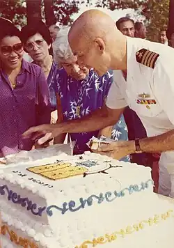 On September 12, 1982, the chapel sponsored a "Jewish Pride in the Navy Day," that included the dedication of an 11 by 7 foot cloth-on-cloth wall hanging for the chapel, designed by local Norfolk artist Leonette Adler, and cut and sewn by Jewish officers, sailors, and their spouses.[11] The celebration included music on the Frazier Hall lawn by members of the Navy band, and tours of local Navy ships. As described by the Navy News, "the hanging features a backdrop of silver moon and roaring waves of blue and white and words from the prophet Isaiah."[11]