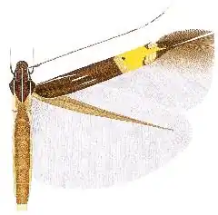 Male, female. Forewing length 4.7 mm. Head: frons shining ochreous-grey with greenish and reddish reflections, vertex and neck tufts shining dark brown with reddish gloss, laterally and medially lined white, collar shining dark brown with reddish gloss; labial palpus first segment very short, white, second segment four-fifths of the length of third, dark brown with white longitudinal lines laterally and ventrally, third segment white, lined brown laterally; scape dorsally dark brown with a white anterior line, ventrally white, antenna shining dark brown with a white line from base to beyond one-half, followed towards apex by approximately seven dark brown segments, four white, two dark brown, two white, ten dark brown and eight white segments at apex. Thorax and tegulae shining dark brown with reddish gloss, thorax with a white median line, tegulae lined white inwardly. Legs: shining dark brown with reddish gloss, femora of midleg and hindleg shining ochreous-grey with golden gloss, foreleg with a white line on tibia and tarsal segments one to three and five, tibia of midleg with white oblique basal and medial lines and a white apical ring, tarsal segments missing, tibia of hindleg with a very oblique silvery white line at base, a less oblique silvery white medial streak and a white apical ring, tarsal segment one with a white basal ring and white dorsal streak in the apical half, segments two to four dorsally white, segment five entirely white, spurs white dorsally, dark brown ventrally. Forewing shining dark brown with reddish gloss, four white lines in the basal area, a subcostal from base to one-quarter bending from costa in distal half, a short medial above fold, its centre under of the distal end of the subcostal, a subdorsal slightly longer than the medial, and a little further from base, a narrow dorsal from beyond base to one-fifth, a yellow transverse fascia beyond the middle, narrowing towards dorsum and with a short and narrow apical protrusion, bordered at the inner edge by a tubercular pale golden metallic fascia with some greenish reflection, and with a small subcostal patch of blackish brown scales on the outside, bordered at outer edge by two tubercular pale golden metallic costal and dorsal spots, the dorsal spot three times as large as the costal and more towards base, the costal and dorsal spots irregularly lined dark brown on the inside, a white costal streak from the costal spot, a shining white apical line from just beyond apical protrusion, cilia dark brown, paler towards dorsum. Hindwing shining greyish brown with reddish gloss, cilia brown. Underside: forewing shining greyish brown, the white apical line distinctly visible in the apical cilia, hindwing shining greyish brown. Abdomen dorsally shining dark brown with reddish gloss, laterally shining grey with greenish reflection, ventrally dark grey, in the middle yellowish white, segments banded shining white posteriorly, anal tuft ochreous-white.[1]