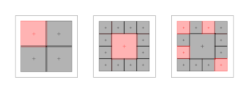 The covering problem of Rado, where a series of squares with parallel edges needs to cover an area of 1. For any set meeting these conditions, a subset of these squares is selected (indicated by the red coloring) in which no two squares overlap, and the total area is maximized. The goal is to make an arrangement of squares so that the total area of the optimal subset is minimized. The examples each have maximal areas of 1/4, but there are some which have slightly lower. [3] [4]