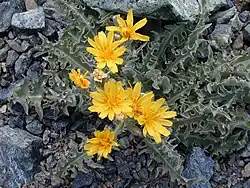 Crepis occidentalis grows in many types of habitat. It is a perennial herb growing a grayish woolly branching stem to about 40 centimeters (16 inches) in height from a deep taproot. The woolly, toothed leaves are up to 30 centimeters (12 inches) long at the base of the plant. The inflorescence produces several clusters of flower heads with hairy, often glandular phyllaries and many yellow ray florets but no disc florets. The fruit is a ribbed achene with a frilly pappus at the tip.[3]
