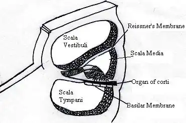 The human ear is made up of three areas: the outer, middle and inner ear. Within the inner ear sits the cochlea. The cochlea is a snail-shaped formation that enables sound transmission via a sensorineural route, rather than through a conductive pathway.[11] The cochlea is a complex structure, consisting of three layers of fluid. The scala vestibuli and scala media are separated by Reissner's Membrane whereas the scala media and scala tympani are divided by the basilar membrane.[11] The diagram below illustrates the complex layout of the compartments and their divisions:[4]