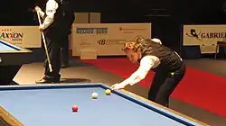 In 1535, Mary of Hungary (governor of the Netherlands) played at a billiard table covered with green cloth in a gallery.[5] James VI and I had a "bilzeart burde" covered with green cloth at Holyrood Palace in 1581.[6] The imprisoned Mary, Queen of Scots, had a billiard table at Tutbury Castle.[7] She complained when her table de billiard was taken away (by those who eventually became her executioners, who were to cover her body with the table's cloth).[4] A 1588 inventory of the Duke of Norfolk's estate included a "billyard bord coered with a greene cloth ... three billyard sticks and 11 balls of yvery".[4] Billiards grew to the extent that by 1727, it was being played in almost every Paris café.[4] In England, the game was developing into a very popular activity for members of the gentry.[4]