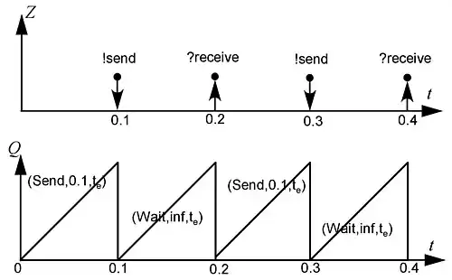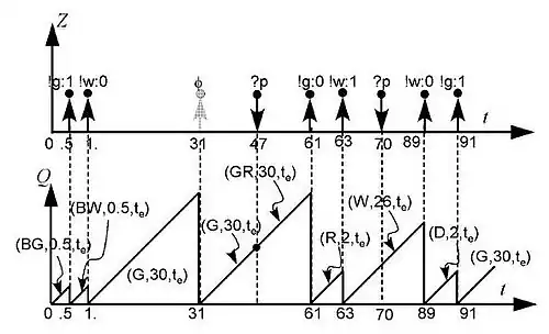One interesting feature of SF-DEVS might be the preservation of schedule the restriction (3) of SP-DEVS which is drawn at time 47 in Fig. 3. when the external event ?p happens. At this moment, even though the state can change from G to GR, the elapsed time does not change so the line segment is not broken at time 47 and can grow up to which is 30 in this example. Due to this preservation of the schedule from input events as well as the restriction of the time advance to the non-negative rational number (see restriction (2) above), the height of every saw can be a non-negative rational number or infinity (as shown in the bottom of Fig. 3.) in a SP-DEVS model.
