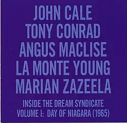 Inside the Dream Syndicate, Vol. I: Day of Niagara or simply Day of Niagara is a bootleg recording of a 1965 performance by the minimalist music group the Theatre of Eternal Music, a.k.a. the Dream Syndicate. Contributors include future Velvet Underground members John Cale and Angus Maclise, composers La Monte Young and Tony Conrad, and artist Marian Zazeela. It received a release in 2000 by the label Table of the Elements against the wishes of Young.[1][2]