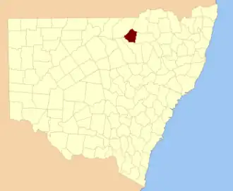 Denham County, is one of the 141 cadastral divisions of New South Wales. It lies between the Barwon River and the Namoi River, where the two rivers meet. It includes the localities of Koothney, Cryon and Bugilbone.