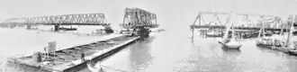 The Egyptian government first established the bridge in 1897 during the reign of Khedive Abbas Helmi II, with the assistance of the French company La Maison Sereau-Louis, to accommodate fourth-class trains and also for single-track passage.[1] In 1926, the government saw the necessity of replacing the metal parts of the bridge and constructing new metal parts supported by the old piers and girders, to accommodate first-class trains for the single track. Therefore, the government commissioned the company Dorman Long. It is 610 meters long.[2]