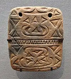 Found in Middle to Final Jōmon contexts, in particular the latter,[1] doban take the form of a rectangular or oval clay tablet and are the ceramic counterpart to the stone ganban.[3] They are known mainly from the Tōhoku and Kantō regions, with those of the former thought to have influenced those of the latter.[3] In Tōhoku, ganban appear to have developed first.[1] A study at the turn of the millennium was able to draw on some 266 clay and stone tablets from 70 sites across Aomori, Iwate, and Akita Prefectures.[4]: 65