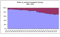 The economy of Norway is a highly developed mixed economy with state-ownership in strategic areas. Although sensitive to global business cycles, the economy of Norway has shown robust growth since the start of the industrial era. The country has a very high standard of living compared with other European countries. Norway's modern manufacturing and welfare system rely on a financial reserve produced by exploitation of natural resources, particularly North Sea oil.[23][24][25][26][27] Among OECD nations, Norway has a relatively efficient and strong social security system; social expenditure in 2022 was below the OECD average and stood at roughly 20.7% of GDP.[28]