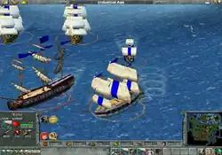 After the Prehistoric Age, units such as naval units can be built. Shown here are; Galley (left middle), Frigate (lower middle), Battleship (top), and Cruiser (upper middle) which are the main ships until galleys are replaced by submarines in the Atomic Age. Cruisers are available from the Imperial Age.