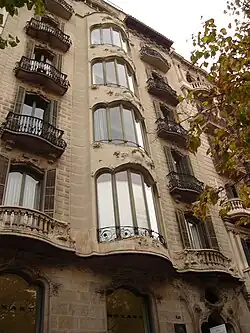 1888–1891 Casa Rodolf Juncadella Rambla Catalunya, 33 House for Rodolf Juncadella. A notable feature is the carving and wrought-ironwork by Pere Carbonell. Good