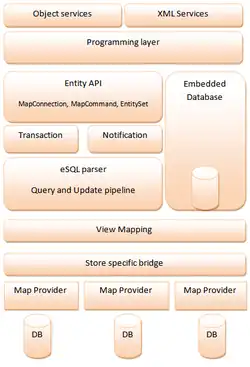 - EDM parser and view mapping, which takes the SDL specification of the data model and how it maps onto the underlying relational model and enables programming against the conceptual model. From the relational schema, it creates views of the data corresponding to the conceptual model. It aggregates information from multiple tables in order to aggregate them into an entity, and splits an update to an entity into multiple updates to whichever table(s) contributed to that entity.