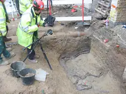 A photographer taking a record shot of a horse burial in a Roman ditch re-cut. A re-cut is a type of feature.