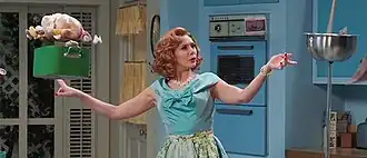 The suit and wedding dress worn by Vision and Maximoff in the opening titles were both made for the series, with the dress created as an homage to Audrey Hepburn's wedding dress in Funny Face (1957).[31][32] Rubeo felt that dress was the most beautiful wedding dress of the period, and sourced the same fabric that was used on the film from a factory in France.[32] Rubeo had to coordinate with Worthington to make sure the colors of the costumes did not blend with the sets when filmed in black-and-white, as her initial costume for Maximoff did not stand out from the color of the kitchen set and had to be adjusted.[33] Makeup head Tricia Sawyer and hair stylist Karen Bartek aimed to portray Maximoff as the ideal 1950s housewife in the episode, with "perfectly curled locks and flawless makeup." They considered details such as the shapes of her eyebrows and nails, as well as how certain colors translated into black-and-white.[34] To shoot scenes in black-and-white, Bettany was painted blue, rather than Vision's maroon color, since the blue appeared better in the grayscale image.[14] Additionally, Olsen used a pinker shade of foundation, a "robin's egg blue-green" eye shadow, a pinky-red nail color, and a darker pink shade for her lips, to help create a natural look for filming in black-and-white.[34][35] Camera tests were required to find the correct colors for Olsen, Rupp, and Bettany's makeup. Wigs were used for the hair styles in the episode to allow it to be filmed at the same time as other episodes without the actors' hair having to be re-styled to change between eras.[34]