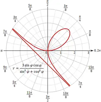 The folium of Descartes can be expressed in polar coordinates aswhich is plotted on the left. This is equivalent to[5]