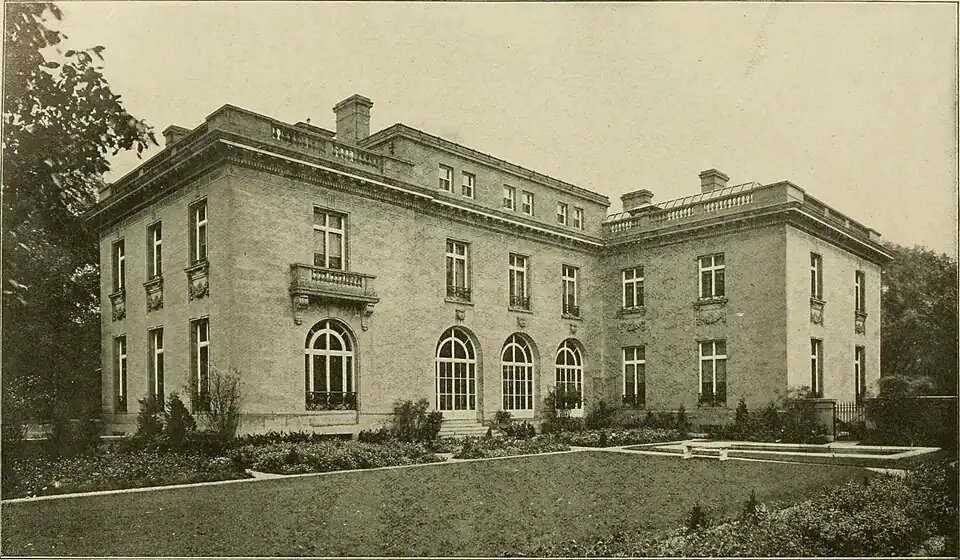 In 1903, Goodyear purchased 762 Delaware Avenue, a Gothic revival house which had been designed by John D. Towle for Myron P. Bush in 1859.[22] Goodyear tore down the Bush house and hired Carrère and Hastings to design his new residence, modeled on a house on the Champs-Élysées in Paris. The firm, today best known for designing the New York Public Library Main Branch and the Henry Clay Frick House in New York, had been responsible for the architectural planning of the 1901 Pan-American Exposition in Buffalo. The Goodyear house reportedly cost $500,000 and was completed in 1906, shortly before Goodyears death.[21]
