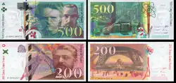 - 500 francs (€76.22): Pierre and Marie Curie — green (introduced 22 March 1995, replacing Blaise Pascal)