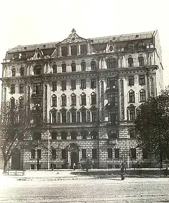 This hotel was built by architect Paul Aloshin for his wealthy father. The building had 54 apartments and one garage. The most expensive of them were located in the central building and contained 7-8 rooms each. On the top floor there was an art studio and 13 living rooms with special niches for sleeping. Each apartment had a wood shed, an icehouse with a refrigerator, a laundry room, a cellar and a piece of the attic. In addition to two passenger lifts Otis companies, there was a special lift for firewood and laundry on the emergency stairs. The house burned down in the Second World War, but drawings of the building have been preserved in the archives.[1]