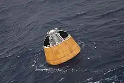The Hindustan Aeronautics Limited (HAL)-manufactured crew module underwent its first uncrewed experimental flight on 18 December 2014.[9] As of May 2019, design of the crew module has been completed.[10] The Defence Research and Development Organisation (DRDO) will provide support for critical human-centric systems and technologies such as space-grade food, crew healthcare, radiation measurement and protection, parachutes for the safe recovery of the crew module, and the fire suppression system.[11]