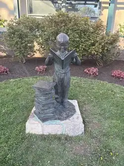 Photo of sculpture called The Book Worm, sculpted by Price, and photographed outside of the Doylestown Branch of Bucks County Free Library in 2025.