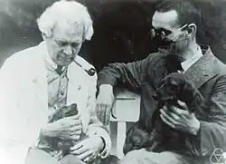 ![]() Gaston Julia (right), with Gustav Herglotz and two dogs | |