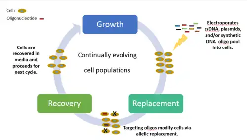 Chemically combined, synthetic single-stranded DNA (ssDNA) and a pool of oligonucleotides are introduced at targeted areas of the cell, thereby creating genetic modifications. The cyclical process involves transformation of ssDNA (by electroporation) followed by outgrowth, during which bacteriophage homologous recombination proteins mediate annealing of ssDNAs to their genomic targets. Experiments targeting selective phenotypic markers are screened and identified by plating the cells on differential medias. Each cycle ultimately takes 2.5 hours to process, with additional time required to grow isogenic cultures and characterize mutations. By iteratively introducing libraries of mutagenic ssDNAs targeting multiple sites, MAGE can generate combinatorial genetic diversity in a cell population. There can be up to 50 genome edits, from single nucleotide base pairs to whole genome or gene networks simultaneously with results in a matter of days.[46]
