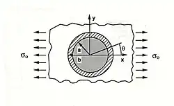 A major breakthroughs of his research was the elasticity solution he developed for the fiber-matrix-interface stress-distribution type problem.[5] The problem itself consists of an isolated fiber in an infinite medium (matrix). A third phase (interphase) is assumed between the fiber and the matrix (see figure 1). The matrix is uniformly loaded in tension. Both the fiber, interphase and matrix are considered to be linear elastic and isotropic. The interface between the three materials is also assumed to be perfectly bonded.
