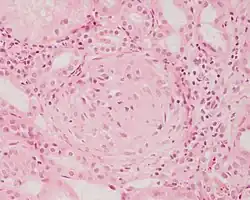 | Photomicrograph of a kidney biopsy from a person with crescentic glomerulonephritis showing prominent fibrocellular crescent formation and moderate mesangial proliferation in a glomerulus. Hematoxylin and eosin stain. | |