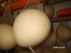 The pallone di Gravina is a firm, semi-hard, cow's milk cheese from the regions of Basilicata and Apulia, in south-east Italy. It is made in the pasta filata style weighing between 1.5 and 2.5 kg (3.3 and 5.5 lb), in a pear-like shape, ball or balloon (pallone), and was traditionally produced in the area of the city of Gravina, in the Murgia area of the province of Bari. Today, however, production is centred on the province of Matera.