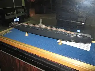 Construction was completed on 11 November 1911; limited trials were conducted at the port as installation of the ship's equipment continued. The early trials were supervised by Lieutenant Commander Stefanos Paparrigopoulos and seven other Greek officers. Basic trials and equipment installation was completed on 11 January 1912, Delfin was then transported by barges to the Schneider trial station at St. Mandrier, near Toulon. Considerable delays in carrying out sea trials and equipment checks led to the postponement of the commissioning until 9 August 1912. A few days later maximum depth trials were performed with the ship diving to 36 m (118 ft). During the course of August and September the ship's crew underwent intense training under the guidance of French officers specializing in submersibles. Most of the training dives took place on a French submarine rather than Delfin itself. As tensions between Greece and the Ottoman Empire escalated the decision was taken for Delfin to depart for Greece before her crew's training had been completed.[8][9] Delfin sailed on 29 September, travelling on the surface and unescorted and arrived at Corfu on 4 October to repair damage to her left engine. She reached her destination the Port of Piraeus the following day, where she was welcomed by the commander of the British naval mission, Rear Admiral Lionel Grant Tufnell, the Minister of Naval Affairs Nikolaos Stratos and the Finance Minister Alexandros Diomidis. The same day Greece declared war against the Ottomans, joining the rest of the Balkan League in the First Balkan War.[10][11] This unescorted, non-stop journey of 1,100 miles (1,800 km) 1,100 miles set a world record and confirmed the abilities of her crew, despite their limited training. However, it also meant that no reserve crew could be trained, limiting her battle effectiveness due to the crew's fatigue.[12] Moreover the Salamis Naval Base did not have the necessary technical facilities to service this new type of ship.[10] It possessed neither specialized workshops nor separate power generators and compressors to address the needs of the ships. [13] Delfin was the first submarine to enter the service of the Greek navy. [14] Nordenfelt I which had been ordered in 1884, had disappointed the Greek authorities during its trials in early 1886 and its purchase was subsequently cancelled. Its hull was abandoned in Piraeus.[15]