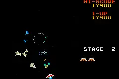The majority of enemies are spaceships, which must be destroyed to complete a level. They appear either from the centre of the screen or from one of the edges, and move in swirling patterns. They can shoot the player's ship or destroy it by contact. They hover near the centre of the screen after completing their deployment pattern, and occasionally fly outwards and shoot at the player. If not destroyed by the player, the enemy ships gradually fly away one by one.