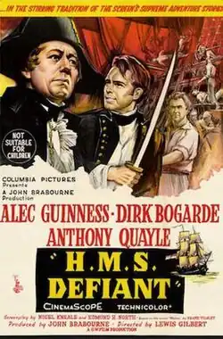 H.M.S. Defiant (released as Damn the Defiant! in the United States[3]) is a 1962 British naval war film directed by Lewis Gilbert with a screenplay by Nigel Kneale from Frank Tilsley's 1958 novel Mutiny,[4] and starring Alec Guinness, Dirk Bogarde, Anthony Quayle, Maurice Denham, and Nigel Stock. Shot in both CinemaScope and Technicolor, the plot concerns a mutiny aboard the fictitious title ship at around the time of the Spithead mutiny in 1797.