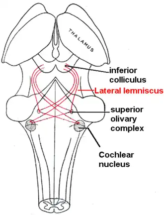 The lateral lemnisci (red) connects lower brainstem auditory nuclei to the inferior colliculus in the midbrain.