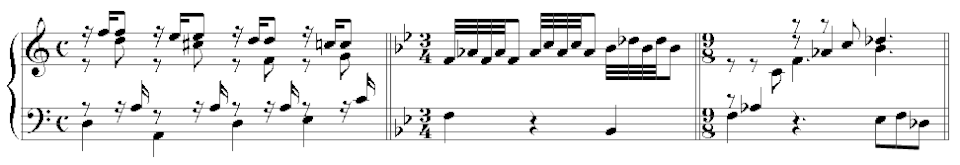 Pachelbel's themes are simple song-like pieces in two sections: four bars in the first section and four or eight in the second.[11] Both sections are repeated. The variations conform to the same concept: most are in common time (except for Aria Sebaldina, in which all variations are in triple time, like the theme) and explore various constant harmony and melodic outline models.[12] Although the frontispiece indicates that the work is intended for either organ or harpsichord, much of the music is better suited for the latter,[13] particularly the brisé figurations, broken chords, and a number of variations that introduce various non-keyboard styles: the strumming of a plucked string instrument, lute style brisé, etc. (see Example 1).[14]