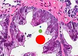 This case could meet the criterion of six times normal nuclear size for intraductal carcinoma of the prostate if size is defined as nuclear area but not if defined as nuclear diameter (blue dot: size of normal nucleus, green dot: size six times normal area and red dot: size six times normal diameter).[20]