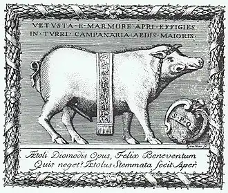 The Calydonian Boar mentioned in the legend became, during the Middle Ages, the symbol of Benevento, to the extent that it is still depicted in the city's coat of arms. In this regard, a 19th-century Beneventan historian notes that the noble origin of Benevento "is fully testified by the Greek marble coat of arms embedded in the bell tower of the archbishopric, depicting the Calydonian Boar killed by Meleager, Diomedes' uncle, in the forests of Aetolia; and the same hunt is observed in a bas-relief existing in the archiepiscopal palace."[8]