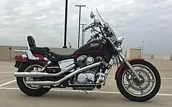 46. ^ "Those Marvelous Middleweights". Motorcycle Cruiser. Bonnier Corporation (published December 2001). 24 February 2009. Retrieved 1 November 2018. The Spirit brings new styling cues including chopped fenders, a skinny 100/80-19 front tire on a wire-spoke wheel, an uncovered fork crowned with a small headlight, a lower and narrower handlebar, a leaner-looking 3.6-gallon fuel tank, a trimmer one-piece saddle that helps lower saddle height by an inch to 26.6 inches, exposed-spring rear shocks and a squat 160/80-15 rear tire.