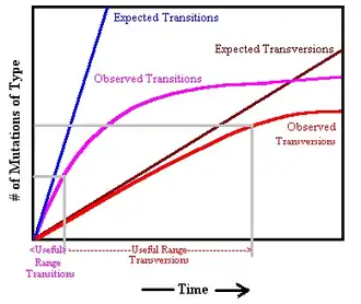 To overcome the effects of saturation, HVR analysis relied on the transversional distance between humans and chimpanzees.[10] A transition to transversion ratio was applied to this distance to estimate sequence divergence in the HVR between chimpanzees and humans, and divided by an assumed TCHLCA of 4 to 6 million years.[11] Based on 26.4 substitutions between chimpanzee and human and 15:1 ratio, the estimated 396 transitions over 610 base-pairs demonstrated sequence divergence of 69.2% (rate * TCHLCA of 0.369), producing divergence rates of roughly 11.5% to 17.3% per million years.