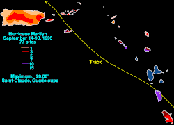 Hurricane Marilyn moved directly across Îles des Saintes and the southern part of Basse-Terre Island in the night of September 14–15, 1995,[3] bringing the highest known rainfall totals to the island from a tropical cyclone. Rainfalls over 12-hours in Guadeloupe were up to 20 in (510 mm) in Saint-Claude, 19.09 in (485 mm) in Guillard-Basse-Terre and 17.63 in (448 mm) in Gaba. The highest wind gust reported in Guadeloupe was 84 mph (135 km/h) in Marie-Galante. The next ones were near 52 mph (84 km/h) in Raizet with maximal wind gust at 68 and 61 mph (109 and 98 km/h) in Desirade.[3] Minimal pressure recorded at 989 mbar (29.2 inHg) in Basse-Terre.