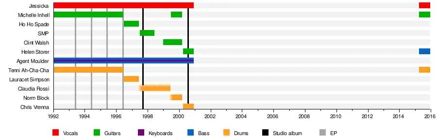 The 2015 roster consisted of Jessicka, Tenni Ah-Cha-Cha, Michelle Inhell (née Oliver), and Helen Storer.[27] Original bassist Robin Moulder was not involved in the reunion shows.[28]