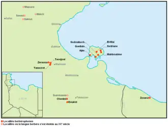 Toponymy is an excellent indicator of the ethnic roots of a region, but we do not have complete studies on the toponymy of Djerba, although the linguist Vermondo Brugnatelli has carried out surveys and partial studies on the toponymy of Djerba.[17] Nevertheless, the work of Arthur Pellegrin (1949) gives various direct or indirect data on the island.[18] Evelyne Ben Jaafar's book (1985) recalls various Libyco-Punic etymologies, although it does not specifically consider the Berber toponymy of Tunisia. An old but very useful work remains that of Émile Laoust (1942), a good model for approaching Amazigh toponymy of the Maghrib.[19] On these points, regional archeology also brings various elements which militate for the continuity from ancient Libyan ("libyque") to Tamazight.[20][21][22][23]