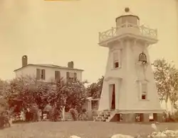 The history of this station is unclear, but some sources indicate that a light station was first established on Jordan Point in 1855. This consisted of a keeper's house with a masthead light on the roof. This arrangement was replaced circa 1875 (possibly as early as 1870) by a separate 35-foot (11 m) pyramidal wooden tower that housed a sixth order Fresnel lens and a fog bell. A new keeper's house was constructed in 1888.[1]