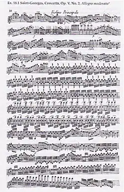 In 1772, Saint-Georges debuted as a soloist with the Concert des Amateurs.[42] He played his first two violin concertos, Op. II, with Gossec conducting the orchestra. The concertos garnered a highly positive reception, and Saint-Georges, in particular, was said to be "appreciated not as much for his compositions as for his performances, enrapturing especially the feminine members of his audience".[43][44]