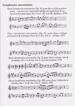 Saint-Georges's first composition Op. I, probably composed in 1770 or 1771, was a set of six string quartets, among the first in France, published by famed French publisher, composer, and teacher Antoine Bailleux.[39] He was inspired by Haydn's earliest quartets, brought from Vienna by Baron Bagge. Also in 1770, Carl Stamitz dedicated his own set of six string quartets to Saint-Georges.[40] By 1771, Gossec had appointed Saint-Georges as the concert master of the Concert des Amateurs.[41]