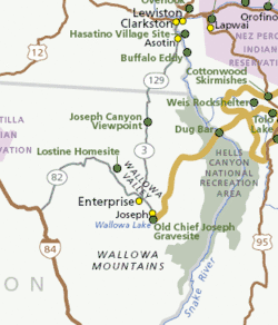 The Joseph Canyon Viewpoint, at a highway pullout along Oregon Route 3, is one of 38 sites that form the Nez Perce National Historical Park. The viewpoint is located approximately 30 miles (48 km) north of Enterprise, Oregon, and 11 miles (18 km) south of the Washington border, in the Wallowa–Whitman National Forest.[5]