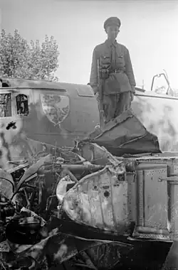 II Gruppe also trained for long-range operations under the command of IV Fliegerkorps. It was brought up to strength with 35 H-16s at Dęblin: where it remained based until 10 May 1944.[84] It trained from January to March 1944. From 31 March to 7 April 1944, it dropped supplies to the Kovel pocket, and rendered support to the 5th SS Panzer Division Wiking.[84] It flew rail interdiction; bombing yards at Rovno, Kiev and Shepetovka from 4–11 May. It joined I Gruppe at Focsani in Romania to evacuate the Crimea, from 11 to 16 May 1944.[84] It moved back to Dęblin but the fuel crisis now prevalent in the Luftwaffe, slowed down the pace of operations. On 21/22 June, with I. and III. Gruppen, it bombed Poltava Air Base, which housed United States Army Air Force bombers that had been flying shuttle-missions to Eastern Europe and landing in the Soviet Union. The raid caused significant losses to the US Fifteenth Air Force.[102] A Heinkel He 177 from 2./Aufklärungsgruppe 100 shadowed the 3rd Bombardment Division, 45th Bombardment Wing to Poltava.[103] The raid, carried out by KG 55, KG 53, KG 27 and KG 4, destroyed 43 B-17 Flying Fortress' damaged 26, and destroyed 200,000 US gallons of aviation fuel.[104]