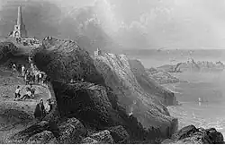 Obelisk Hill Halt was located between Dalkey and Ballybrack stations on a section of the Dublin and Wicklow Railway's coastal branch. The station was named after the nearby obelisk, located on the hill above the bay. The Dublin and Wicklow Railway opened the station one year after constructing their line from Dún Laoghaire to Bray in 1854.[4] The station only had one platform located on the down side of the line, as the line between Dalkey and Killiney was originally built as single track. The station also featured a footbridge, and was accessed from the parallel Vico Road above the railway. A walled pathway also existed on the seaward side, giving access to a small cove. This allowed sea bathers continued access to the shore, which the new railway would otherwise have prevented. Obelisk Hill closed on 1 January 1858 and was replaced by the original Killiney railway station at Strathmore Rd.[5] Today, only one of the footbridge piers at the former station site remain, as does the now crumbling walled pathway on the seaward side. At the southern end of the station site is a footbridge over the railway at Whiterock beach, while at the northern end is the southern portal of Dalkey Tunnel. The line between Dalkey and Killiney was eventually doubled in 1882.
